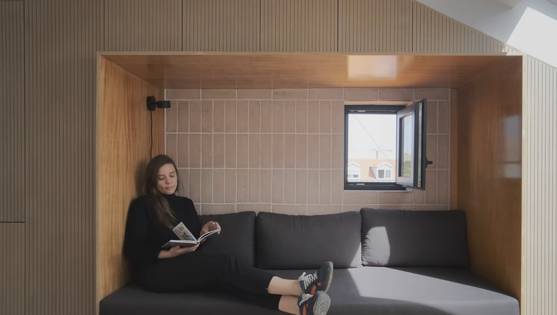 I find a quiet joy in the materials that now surround me. The walls at the entrance are covered in beige fiber cement panels, and a large mirror sits above the stairs to reflect light and hide the utilitarian fuse box. My living room is a sanctuary of cleverness. Along the back wall, I have a storage unit integrated into the gable, made of colored MDF that provides insulation and keeps the clutter of the world at bay. My kitchen is a secret I share with the room; it hides behind pocket doors that slide away to reveal an induction cooktop when I am ready to create.
